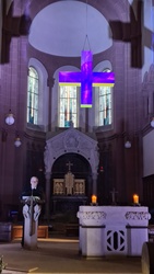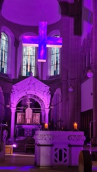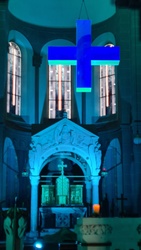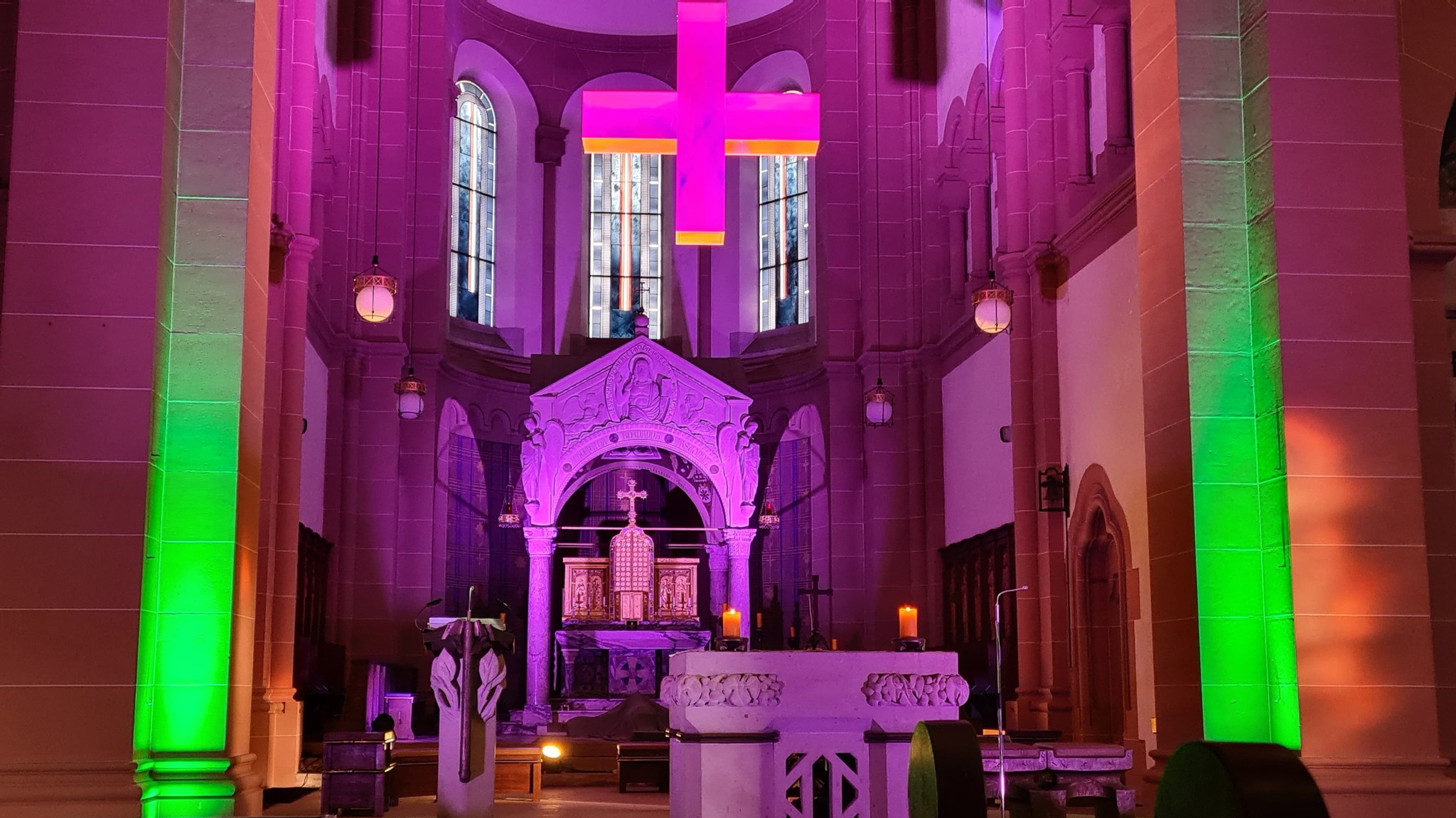 Das Lichtkreuz, ein kunstvolles und symbolträchtiges Element, wurde in der St. Adalberokirche installiert und erstrahlte in verschiedenen Farben, die die unterschiedlichen Stimmungen und Themen widerspiegelten.