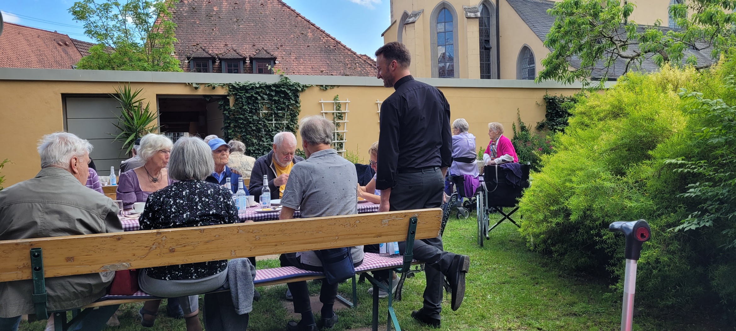 Bei herrlichem Sonnenschein und sommerlichen Temperaturen gab es eine Führung durch die Kirche St. Stephanus in Randersacker. Pfarrer Fuchs erklärte, dass die Baugeschichte der Kirche, eng zusammen hängt, mit der Geschichte des Dorfes Randersacker.Danach waren die Senioren in den Pfarrgarten eingeladen, wo bei leckerem selbstgebackenen Kuchen und Kaffee sich unterhalten und die Blumenpracht bestaunt wurde. Zum krönenden Abschluss ging es dann noch in das Weinlokal Spielberg.