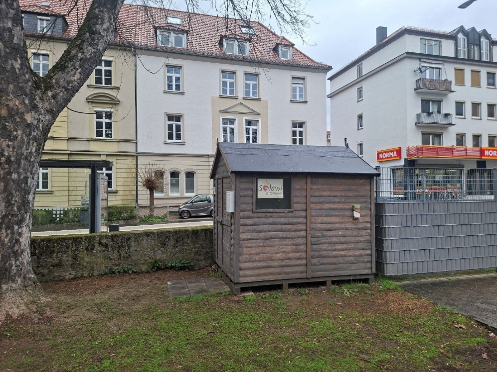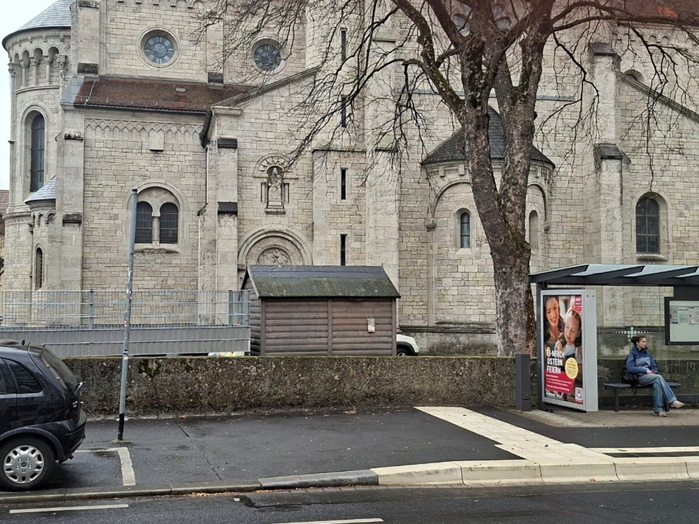 Auf der Außenfläche der Kirche St. Adalbero in Würzburg an der Franz-Ludwig-Straße befindet sich schon seit Jahren ein kleines Holzhäuschen: