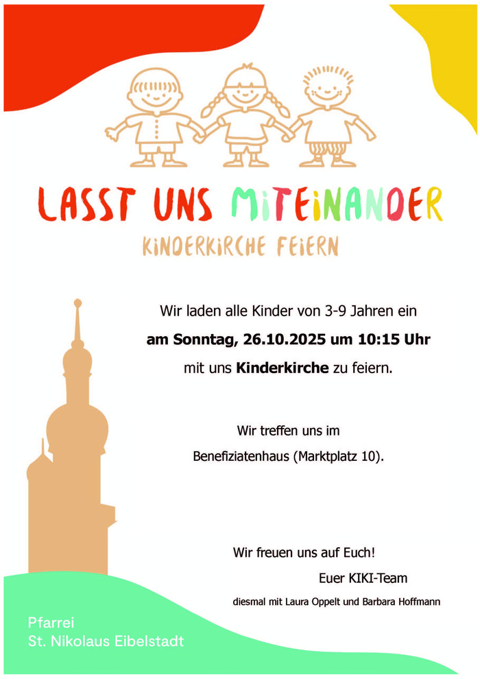 Wir laden alle Kinder von 3-9 Jahren ein am Sonntag, 26.10.2025 um 10:15 Uhr mit uns Kinderkirche zu feiern.