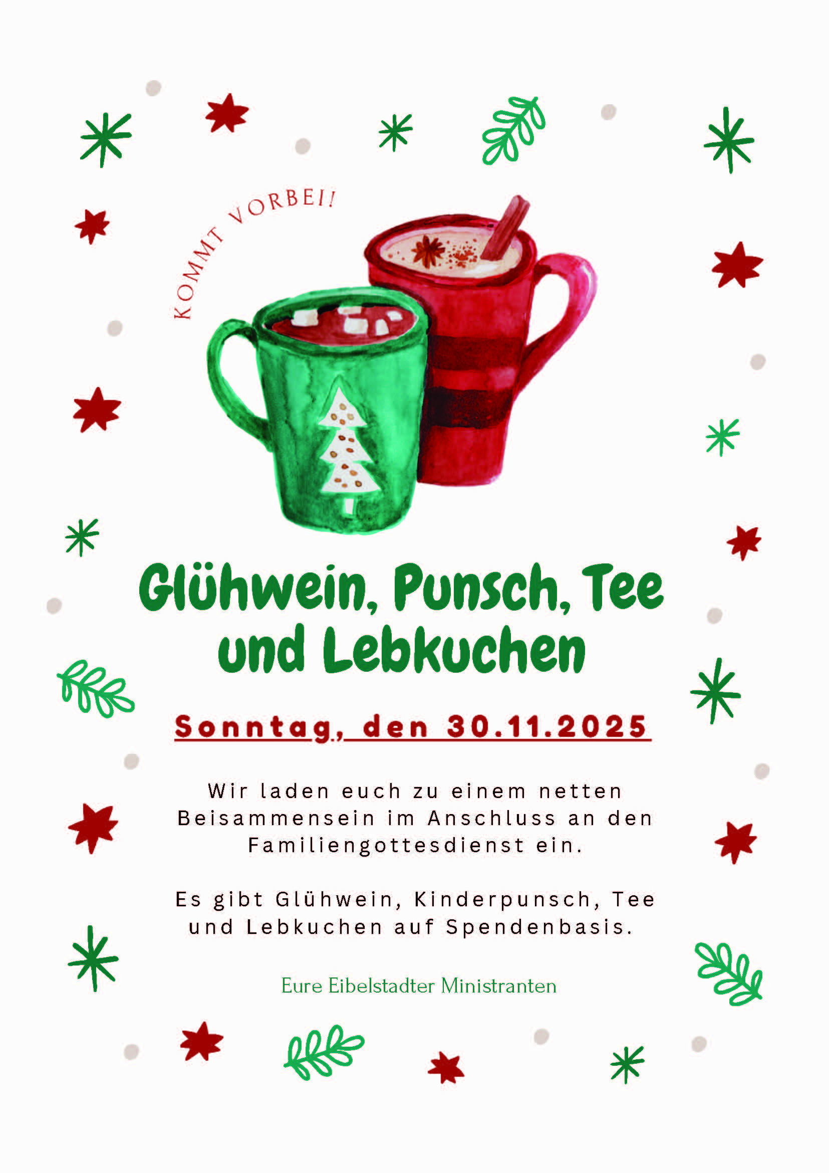 Wir laden euch zu einem netten Beisammensein im Anschluss an den Familiengottesdienst ein.